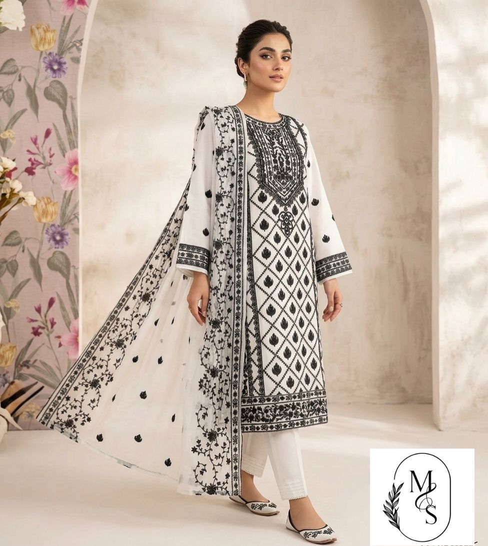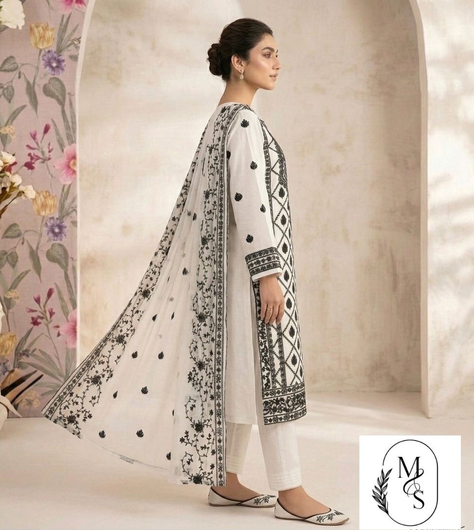 • Artistic Dupatta: A matching white dupatta adorned with delicate black floral vine borders and scattered leaf motifs.