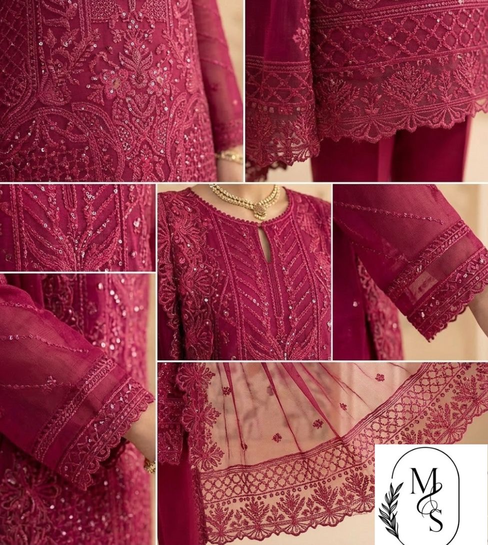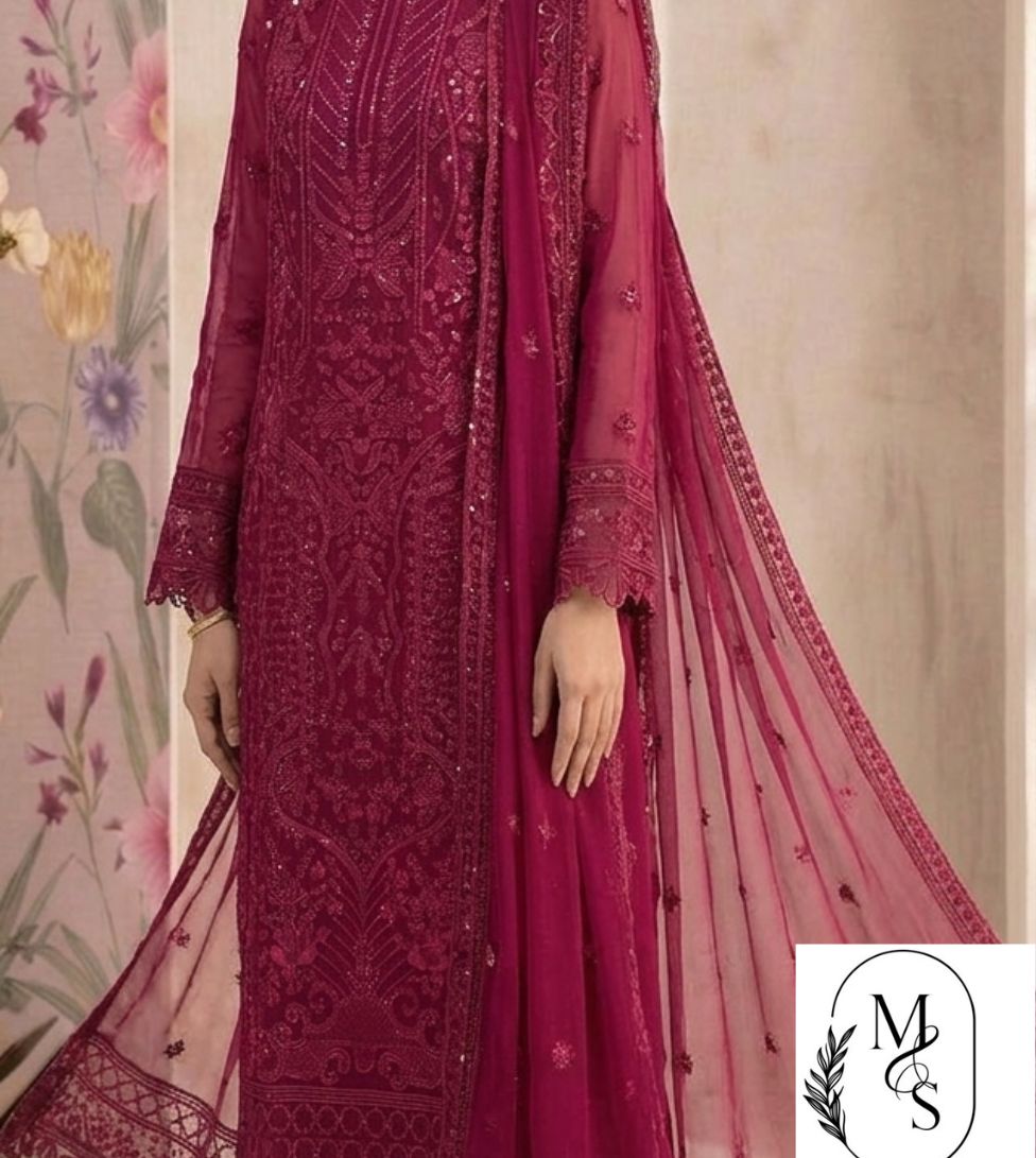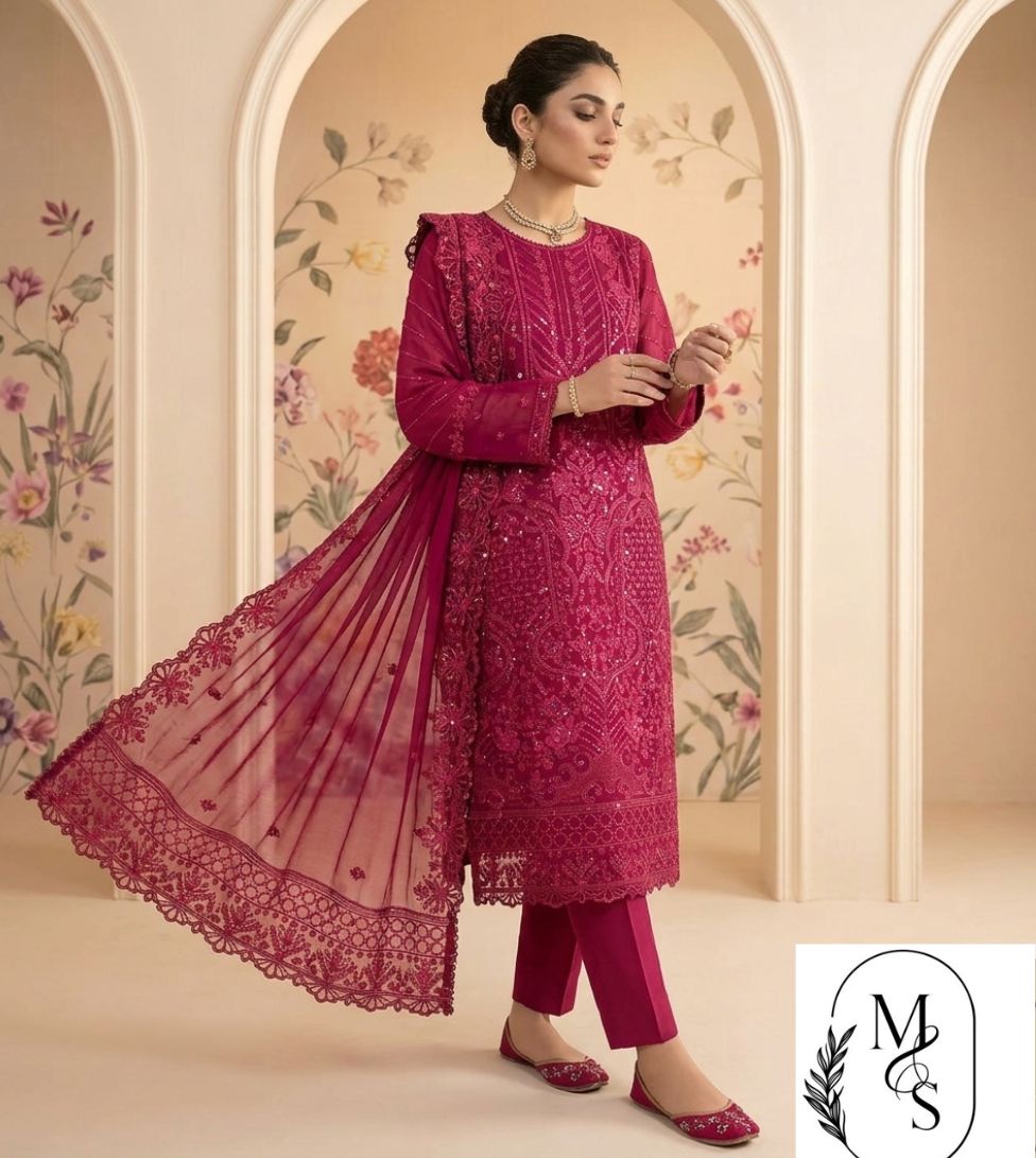 Make a statement with this stunning magenta formal suit. This elegant 3-piece outfit is made from high-quality net fabric, completely covered in rich, detailed embroidery and shimmering sequins. The shirt features a beautiful pattern that flows from the neckline to the hem, while the sleeves are sheer and stylish.